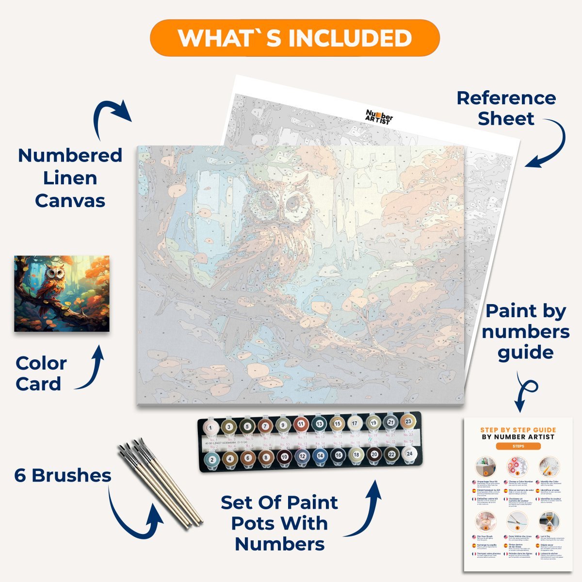 Unveil every essential neatly packed in our Paint by Numbers kit. With each component labeled and ready to use, you can focus solely on your artistic journey. From the vibrant paints to the precision brushes, we've ensured that nothing stands between you and your canvas. Suitable for both beginners and seasoned artists, this kit offers a pure, uninterrupted painting experience.